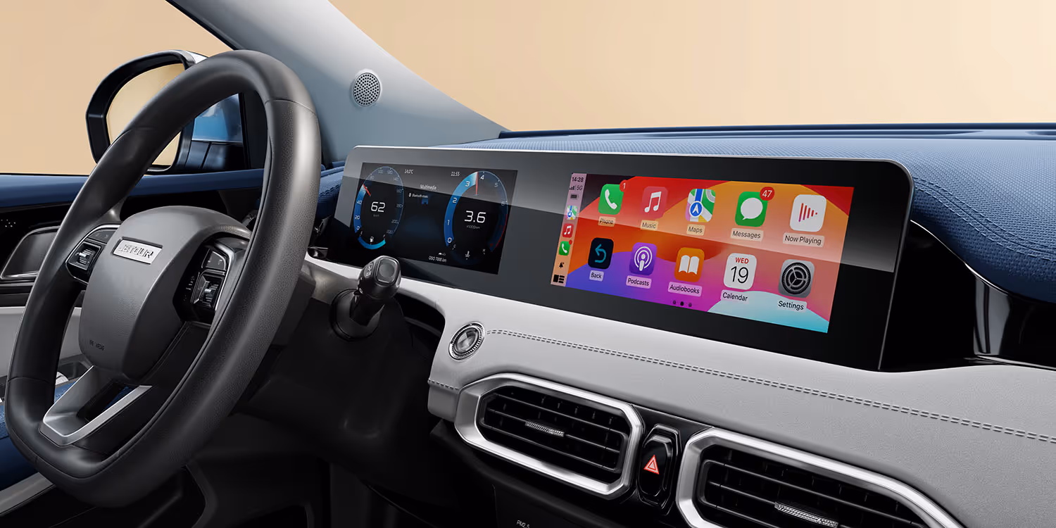 El habitáculo integra pantallas digitales (cluster + central), conectividad Apple CarPlay/Android Auto, cargador inalámbrico y techo panorámico opcional; funciones pensadas para una experiencia conectada y práctica en tu día a día.
